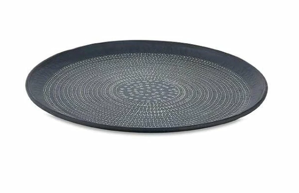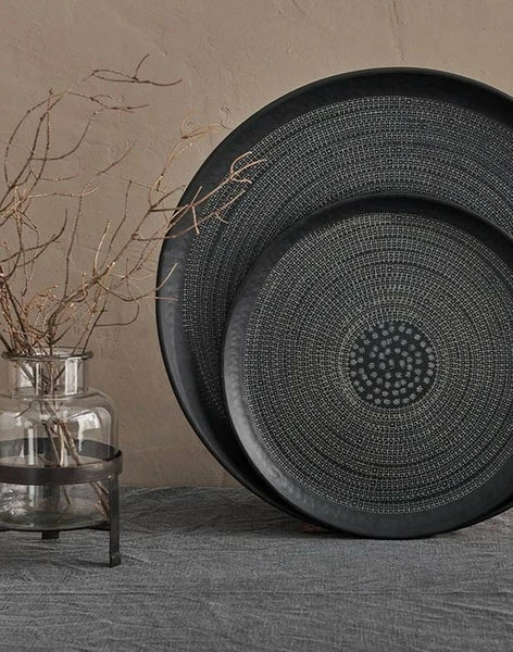 Mahika trays are made from aluminium in this dramatic black finish, the intricate pattern is etched by hand using traditional methods, to great effect. The trays make a stylish back drop and practical piece. These trays are individually decorated using traditional hand etching techniques. Available in 2 sizes Large 2cm x 54.5cm (dia) and small available here.