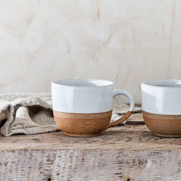 The appealing terracotta and off -white dipped glaze design of our Mali coffee mug combines beautifully. We think this has the ideal proportions for the perfect cup of coffee. ese tactile pieces are produced in a small kiln, made simply from bricks and lit by an open fire. The process is time consuming, but we believe it is well worth the wait. Our Mali pottery is handmade in southern India as part of a fair-trade project. The project was established to provide training and secure employment for men and women both, from disadvantaged backgrounds. The scheme now employs 40 people and focuses particularly on empowering women in the workplace. 8cm x 9.5cm x 9.5cm