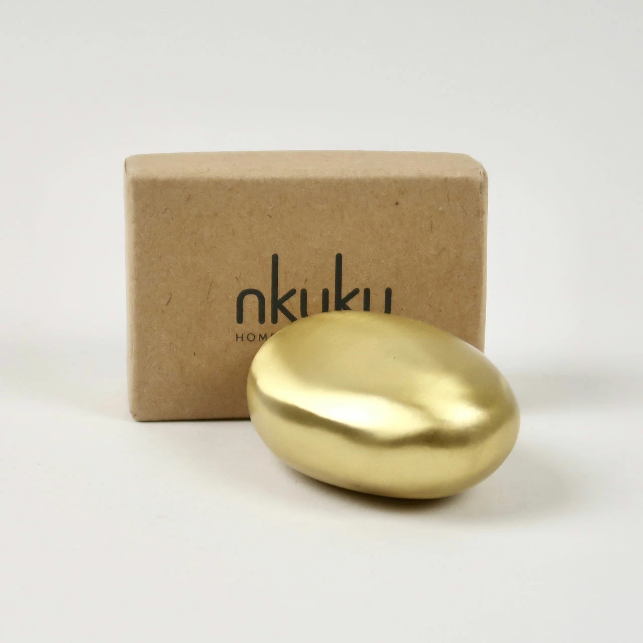 The paperweight comes in a smart kraft brown box and is cast from solid brass. There used to be a product that could be found in the Innovations catalogue that claimed to remove the scent of onions from your hands without the need for soap and there is something of that product reminiscent in the shape and form of this.
