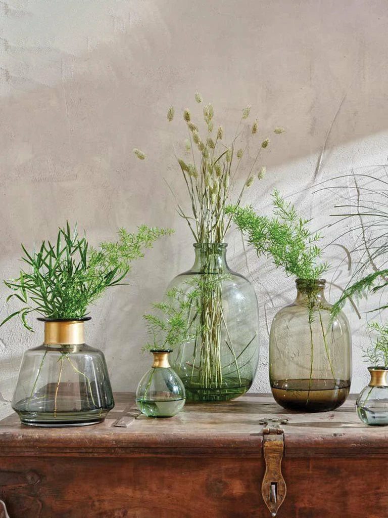 The organic shapes of the Lua Glass Vases from Nkuku are given even more appeal by their light earthy green tones. The traditional bottle shape is ideal for display. To care for this item, we recommend regularly wiping with a soft, damp cloth. Glass 36cm x 22cm x 22cm Capacity 10000 ml