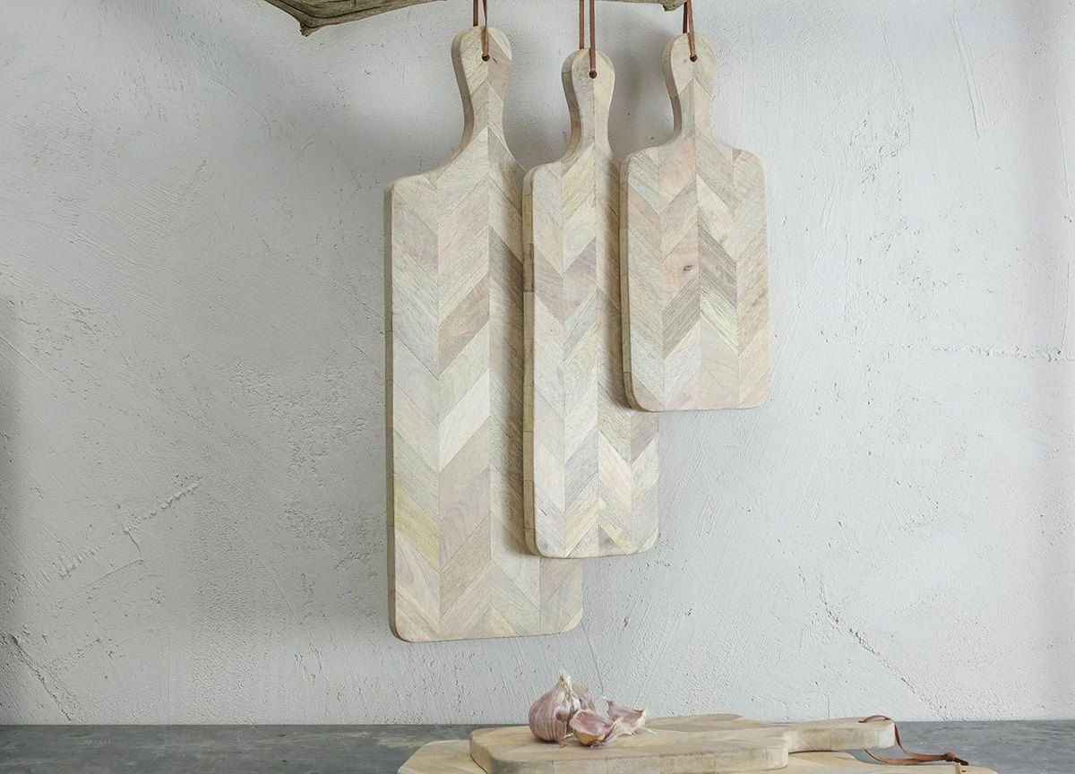 These long, rectangular, Nalbari Chopping Boards are striking and practical. Skilfully pieced together from segments of sustainable mango wood, the natural colour variations create an interesting and texture rich patchwork. Use them as a chopping board or sharing platter for informal delights from antipasti to artisan breads.