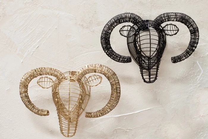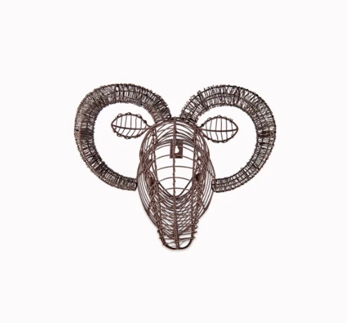 Mini wire goat head trophy for a very special touch and to decorate your walls with original and exclusive objects. Our charming mini goat heads are hand-shaped from wire, and their strong curved horns are a testament to the skill of the craftsman who created them. They are a true piece of art. They are the perfect size to decorate the wall above a desk or in a hallway. Combine various elements like photo frames, trophies, and other eclectic pieces.
