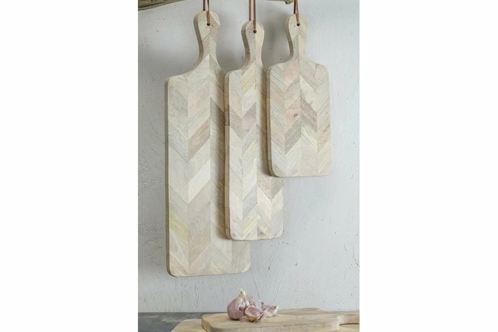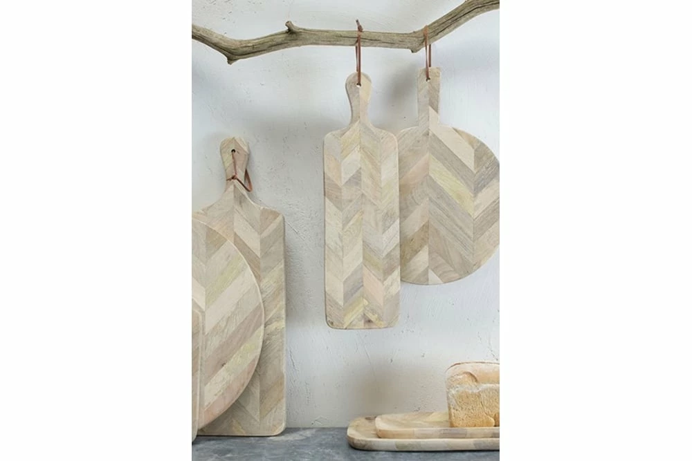 A practical yet striking addition to your kitchen, Nkukus Nalbari chopping board has been handmade by artisans with the highest level of skill, piecing together many segments of sustainable mango wood to create a herringbone design. Showing off the beautiful natural grain of the wood, the chopping board is ideal for informal dining – think antipasto or breads and cheeses.
