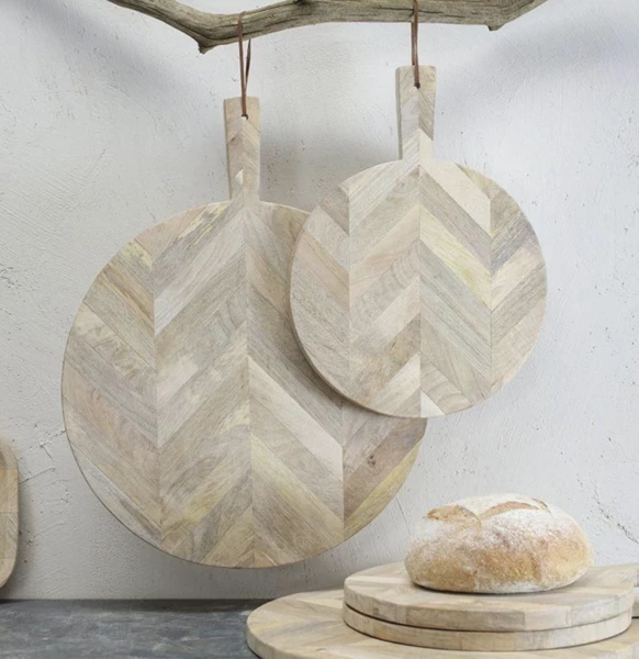 These round Nalbari Chopping Boards are striking and practical. Skilfully pieced together from segments of sustainable mango wood, the natural colour variations create an interesting and texture rich patchwork. Use them as a chopping board or sharing platter for informal delights from antipasti to artisan breads. Large 59 x 46cm Words of wisdom Our mango wood pieces are created from sustainable mango wood. The Mango trees are initially grown for their fruit, harvested over a number of years. Once the trees have stopped bearing fruit, they can be cut down and used to make our wooden pieces. This allows farmers to plant more trees and provides them with a supplementary income. Food Safe, Dishwasher Safe, Do Not Microwave or Oven Country of origin – India