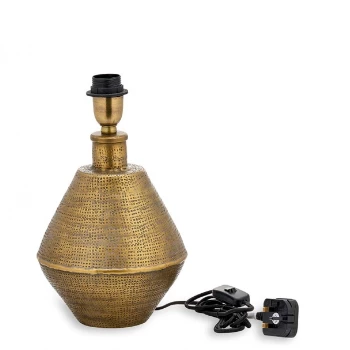 The unique shape and rich antique brass of Nkuku’s handcrafted Nalgonda lamp makes it a striking addition to any room. The decorative pattern has been carefully applied using traditional tools. The table lamp showcases the handmade process with an exposed soldered join. These artisan touches and irregularities add an individual charm to each lamp.