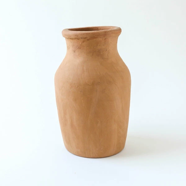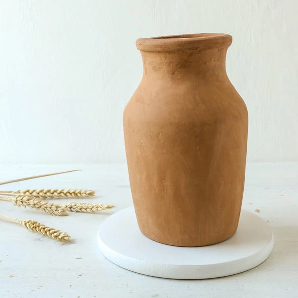 The understated shape of the Narpala narrow terracotta vase makes it a welcome addition to any sideboard or shelf. Perfect as a standalone accessory or as a sculptural element of a curated display, the warm terracotta has an appealingly natural quality. Available in multiple sizes and shapes, perfect for grouping. Clean with a soft dry cloth. Indoor use only. This item has an inside sealant, and therefore not food safe. 23 x 14 x 14cm
