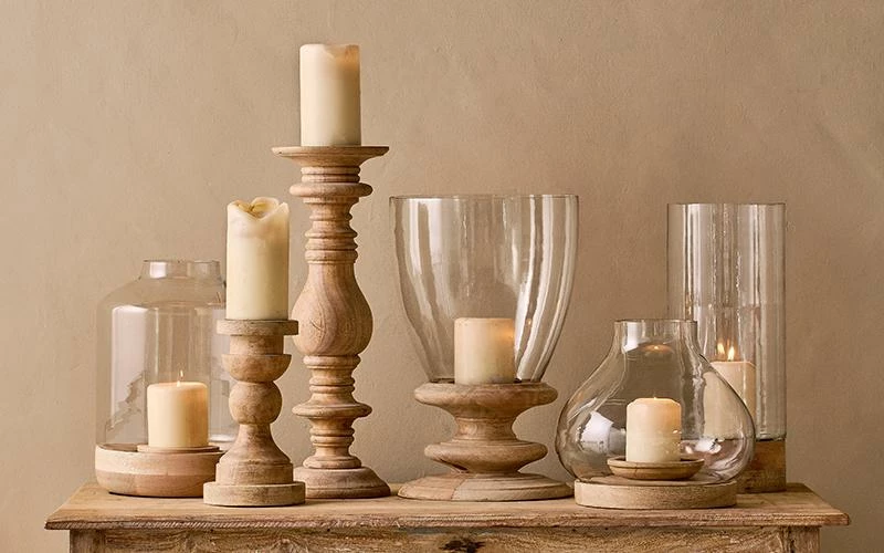 Perfect for atmospheric evenings, our stylish Naryla lanterns have a glass bulb shape that sits perfectly in a solid mango wood base. The elegant contrast of natural wood and recycled glass work beautifully together. The practical glass surround makes these suitable for outside use