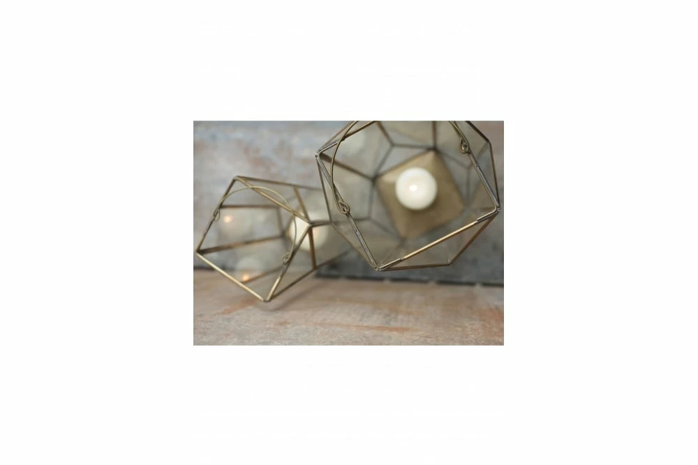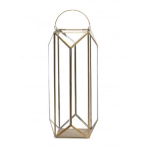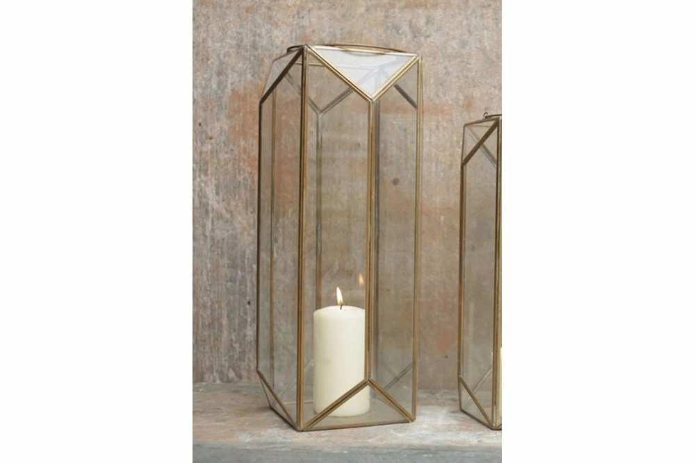 Nkuku Ndiki Lantern Brass Handmade Faceted design Can hold a candle Large 50 x 25 x 25cm Product Code: 26758 Elegant and striking, the Ndiki lantern from Nkuku is perfect for adding a cosy glow to the room. Not only a beautiful decorative piece, this handmade lantern can also house a church candle, allowing its soft light to bounce around the room thanks to the large glass faceted panels.
