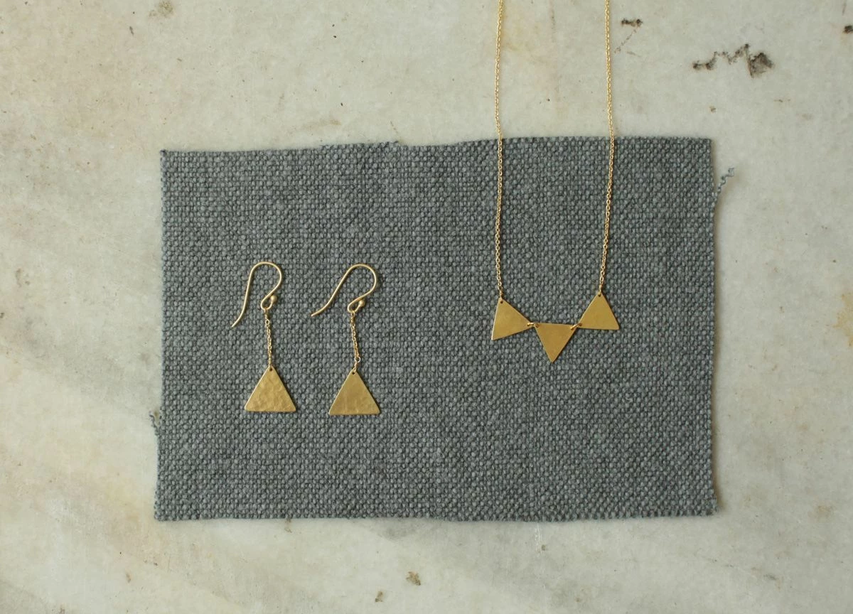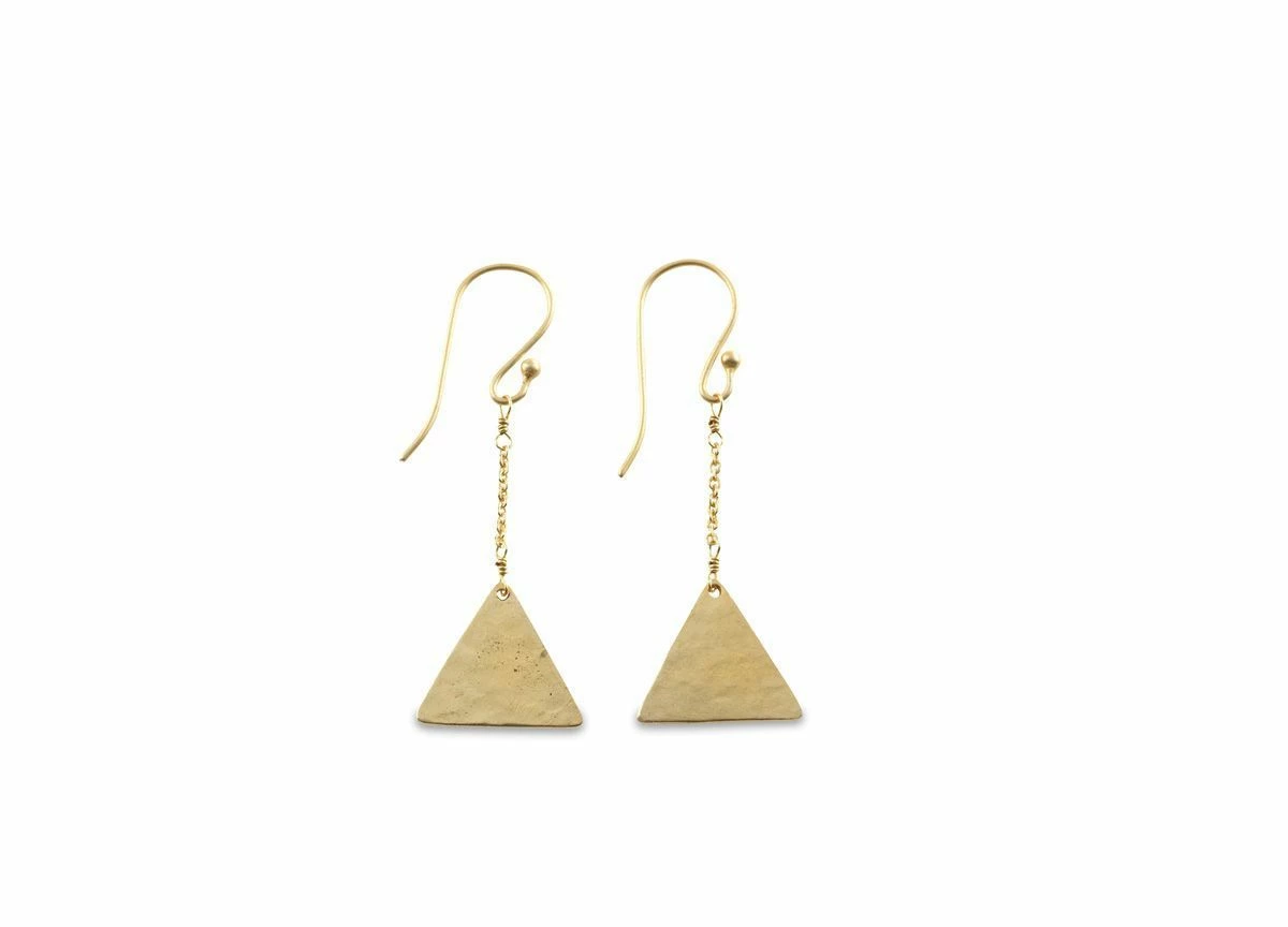 This beautiful Neekala Earrings from Nkuku has been handmade by artisans in Rajasthan. All Nkuku jewellery is handmade for them by a fair trade enterprise. It is made from brass plated in 22 karat gold. The lovely triangle shape has been hammered to create a textured surface to the decoration. A simple but stylish design.