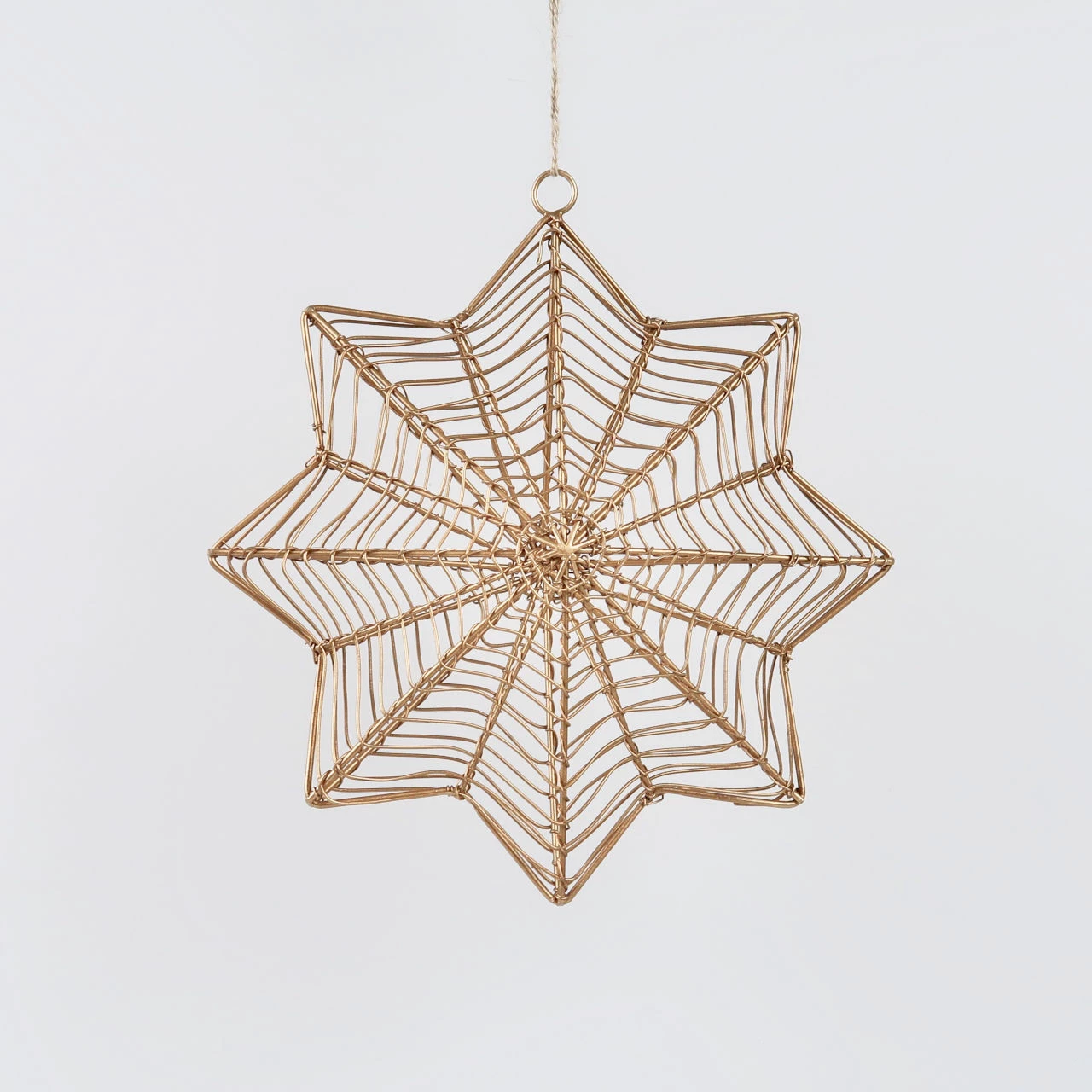 These Ngoni decorations are made from brass wire which is formed, twisted and tied into this 3D star shape. The effect is a bit like a shiny gold star shaped cobweb . . . but with two layers of cobweb joined together so that the effect is doubled. The star has 8 points and has a brass ring attached to one of the points with twine treaded through this ring to allow for the decoration to be hung.