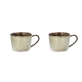 A stoneware coffee mug with a moss green glaze on the inner surface, and a subtle off-white glaze with undertones of the natural clay on the exterior. The mugs are made using a reactive glaze meaning no two items are the same.