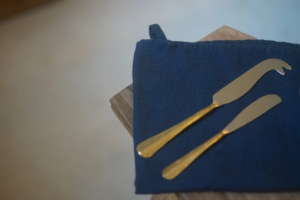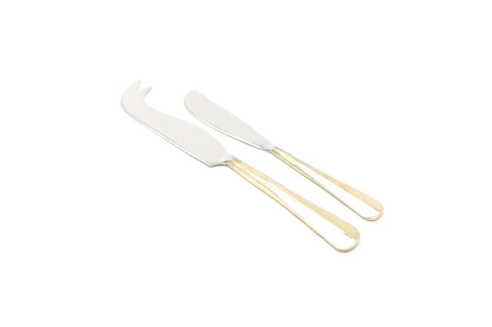 This duo contains a cheese and butter knife that have been handmade with textured handles and a sleek brushed gold finish. Perfect for serving up a cheese course at the dinner table. Each piece is made from durable stainless steel; the handles are forged using traditional techniques Set comes in a gift box. Size: Butter Knife: 17cm, Cheese Knife: 21cm.