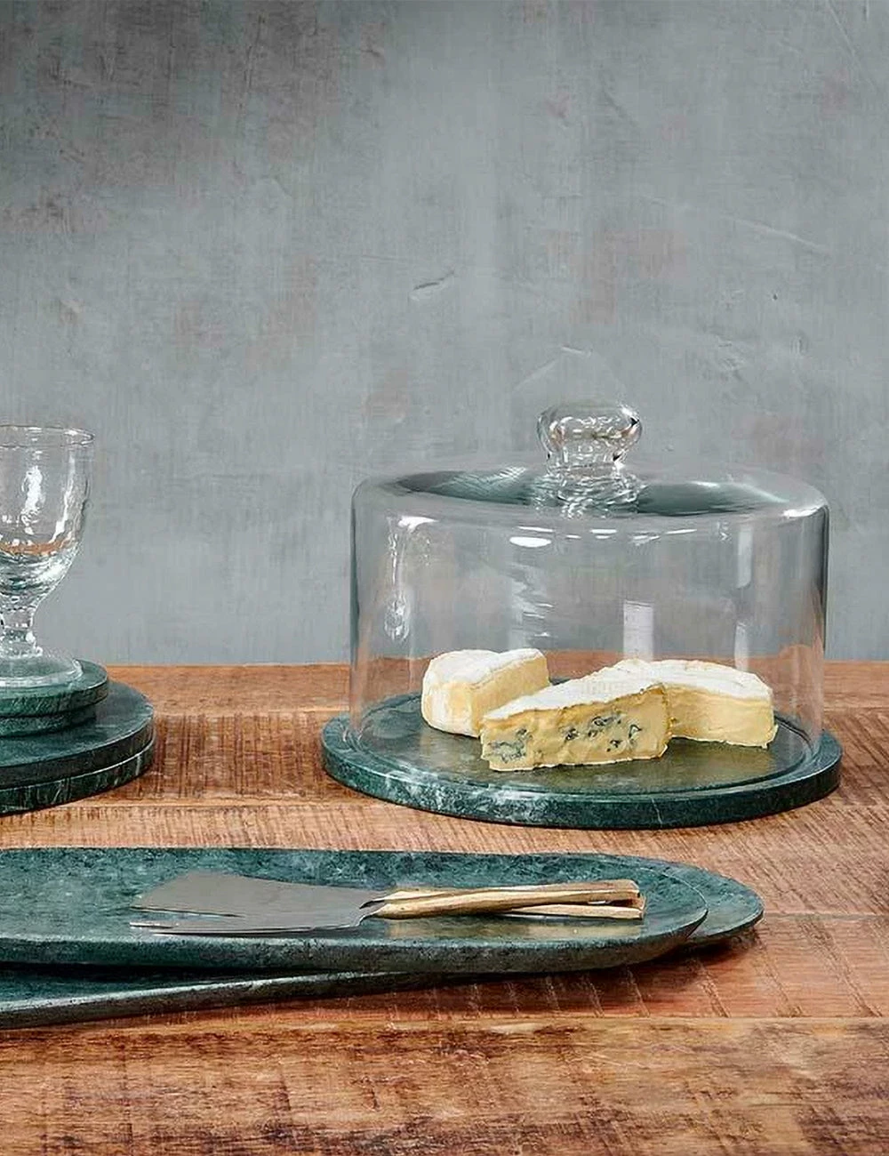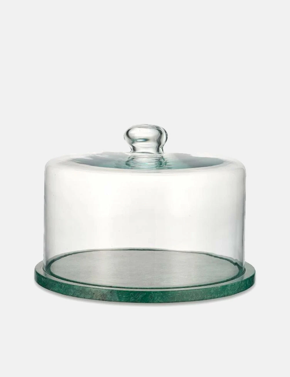 An Nkuku Ovah Marble Cake Dome made with deep green marble base and glass cover. A lovely service ware piece, crafted from solid marble with variegated green tones, each piece is unique. Great for displaying cakes or cheese selections.Material: Marble & Glass
