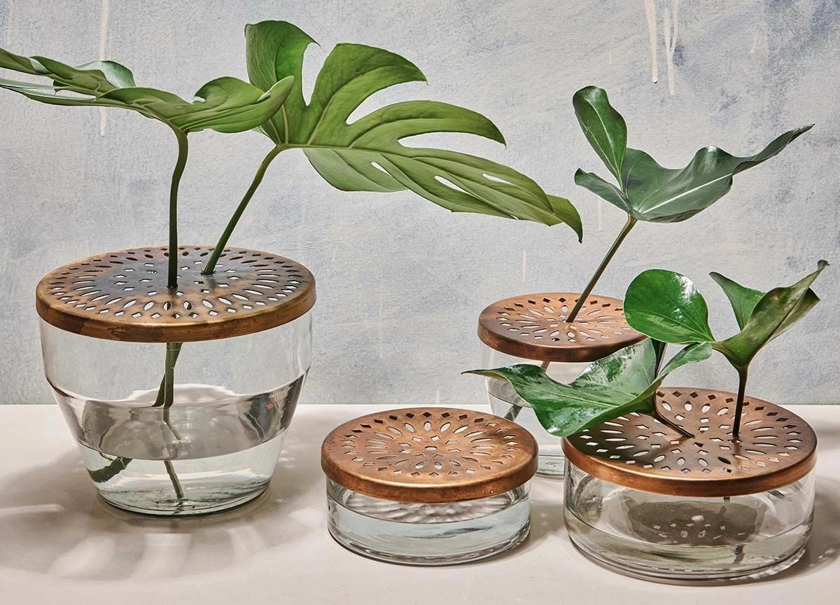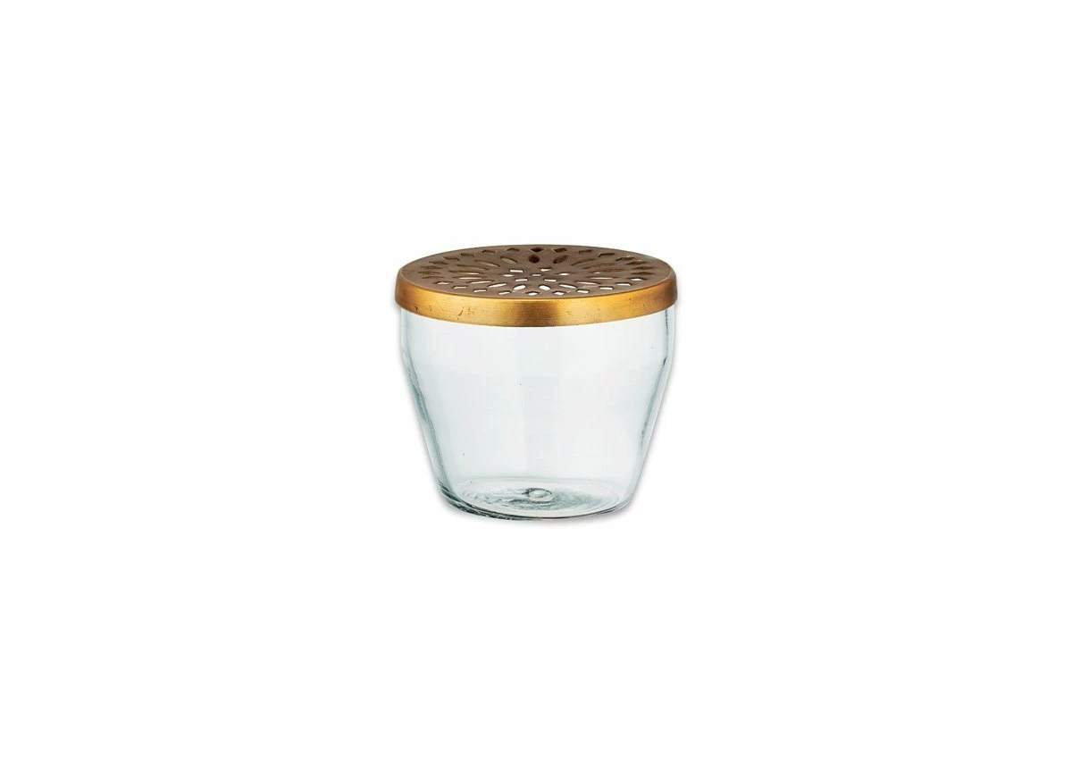 This ‘Ramla’ glass vase has an aged brass lid designed to hold flower stalks. The worn antique brass tones on the lid provide an attractive decorative detail. Fill with fresh cut flowers and leaves or twigs to create a pretty green corner in your home.