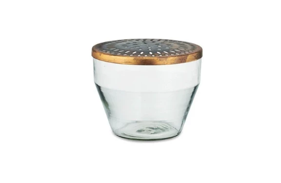 The lid of this elegant Ramla Vase has an antique brass finish, the look is aged antique and the patina is varied. Colour: Clear Material: Glass & Iron Size: 19m x 23.5cm x 23.5cm Weight: 1750g Capacity: 2200ml Our circular Ramla vase is decorated with an antique brass lid. The cut out pattern on the lid is designed to hold the stems of flowers and foliage, creating striking displays.