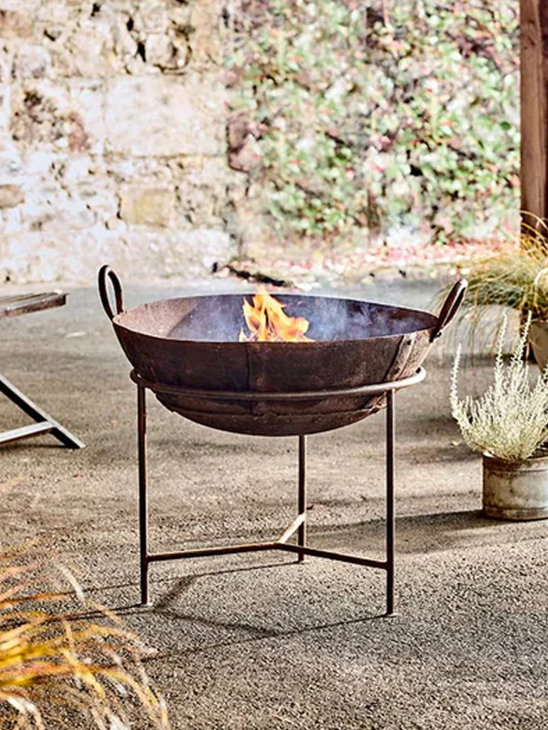 The reclaimed Kadai with grill from Nkuku, has been crafted from reclaimed metal that is up to 100 years old. The rustic, weathered patina illustrates its previous life. Traditionally used as cooking bowls, Indian families would gather together and cook vast curries and other traditional dishes to share with family and friends. Nkuku has adapted their Kadai’s to include a stand and grill making them great for barbeques or you can simply remove the grill and use them as a fire bowl, bringing warmth and atmosphere to an outdoor setting. These Kadai’s are sturdy and heavy, their heritage adds to their unique look and feel, providing a sense of quality and longevity. * Please note that once this item has been placed we will contact you with a delivery quote. 55 (H) x 70 (W) – 80cm (D) Approx height from floor to bowl base 28cm 31.2kg Iron Country of origin – India