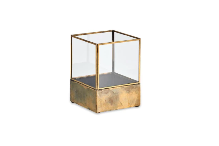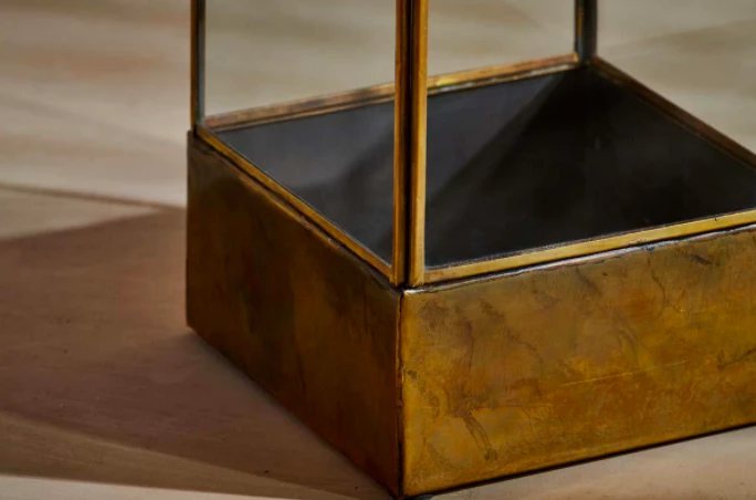 Set an ambient mood with soft candlelight from our Sampara Storm Lantern. The antique patina gives a feeling of age – old elegance, complemented with a simple box design. This lantern is perfect for a low church pillar candle or t-light.