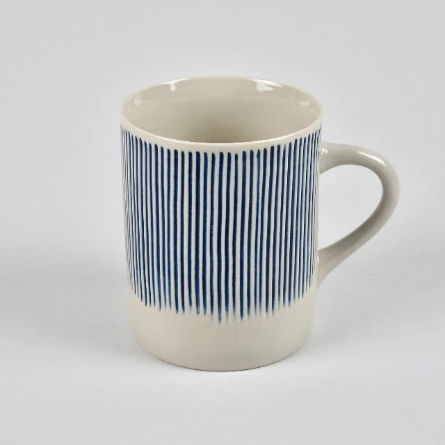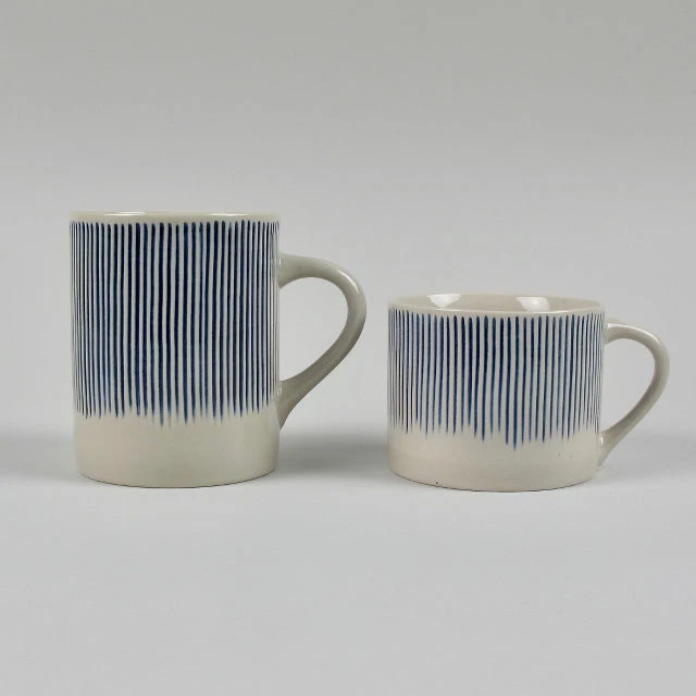 These mugs from Nkuku are made in Vietnam and are produced in both this size and a smaller coffee cup variation. The design is both incised into the side of the mug and decorated by hand, there is thus slight tonal differences in the blue glaze from piece to piece and the textured finish of the impressed design is especially pleasing to hold.