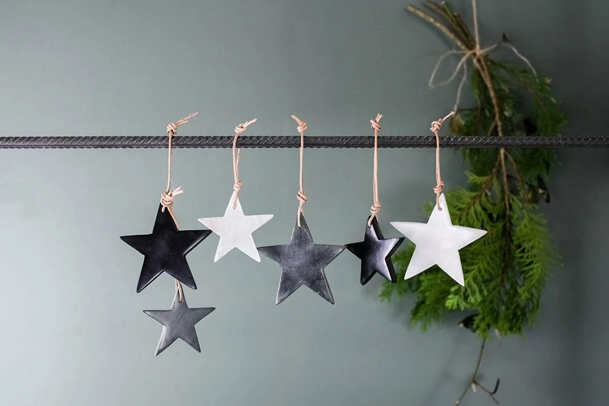 These Morwa decorations are cut from solid marble. The tactile nature of this material adds to the charm of these eye-catching decorations. Each one is strung with a natural jute tie. These collections are made from natural marble and there will be variations in the finish of each piece. Our marble is sourced from Rajasthan.