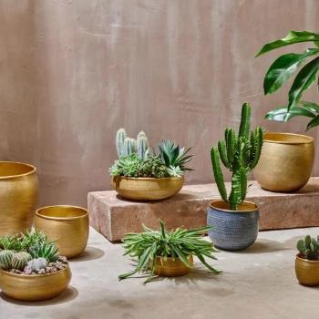 Planting has never looked so striking with our Tembesi collection of planters. Handcrafted from aluminium and finished in a warm brass hue, the collection is ideal for house plants, cacti and succulents. The etched detailing on the exterior is all made by hand and gives this eye – catching collection a real point of difference.