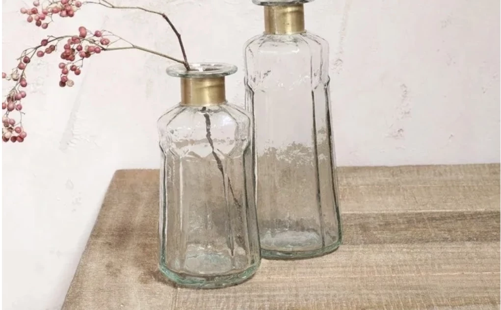 This Chara bottle is full of sophisticated rustic charm; these artisan made pieces involve hammering the glass with traditional tools providing a subtle textured affect. The glass is skilfully blown through the brass ring creating this elegant shape. Solder marks are often evident on the brass as a result of this complex handmade process.
