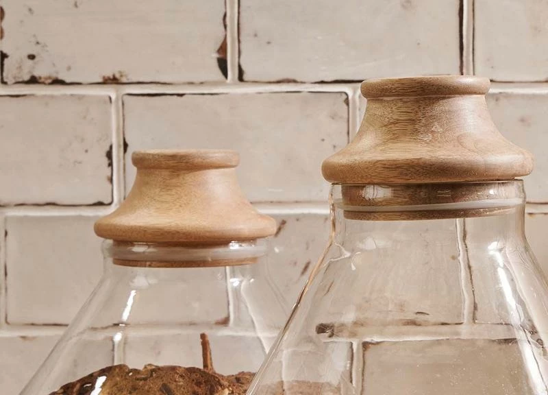 We are elevating kitchen storage to a new high with these handblown glass jars. Their refreshed shape and hand-turned natural mango wood tops combine for a truly elegant finish. Ideal for storing dried food such as pulses and pasta.
