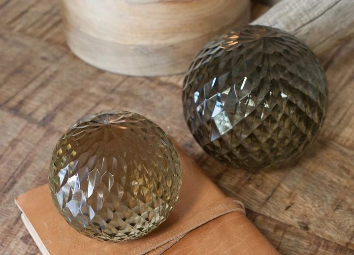 These elegant spherical desk paper weights are made from glass and decorated with this striking cut glass pattern.