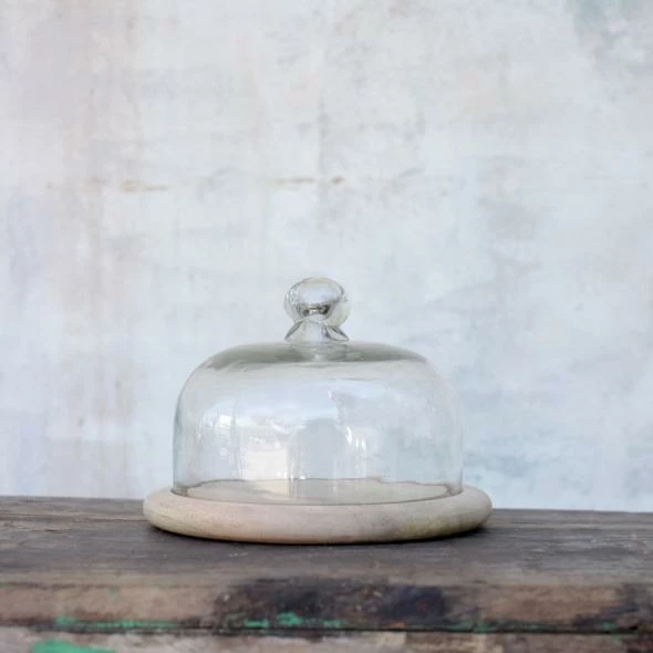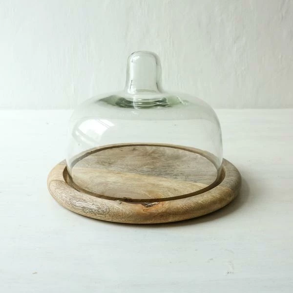 A small mango wood board with a recycled glass dome, perfect for cheeses, butter or small cakes. 14 x 19.5 x 19.5cm Made from: Mango Wood and Recycled Glass