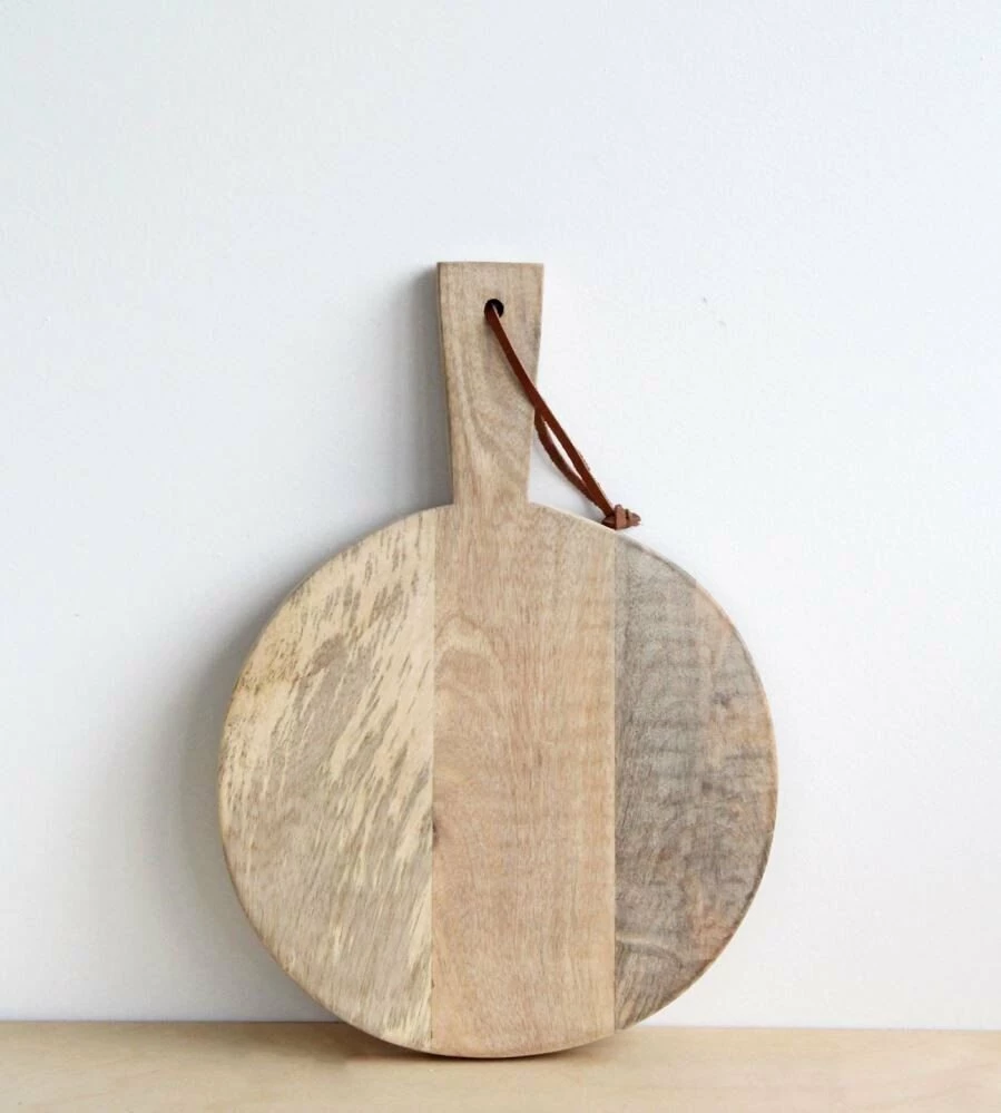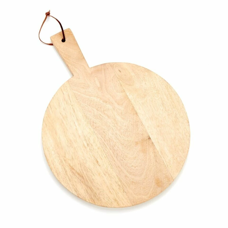 Each pizza board is handmade from sustainable mango wood and comes complete with a leather tie. The natural grain and beauty of the wood add to their style. Great for not only pizzas but also cheese, antipasti and bread. The mango trees used to make these boards are initially grown for their fruit, harvested over a number of years. Once the trees have stopped bearing fruit, they can be cut down and used to make our wooden pieces. This allows farmers to plant more trees and provides them with a supplementary income. Size: Small 34.5 x 24 x 2cm.