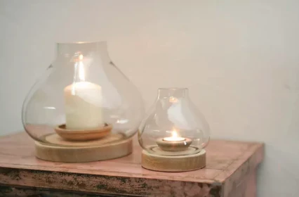 Perfect for atmospheric evenings, our stylish Naryla lanterns have a glass bulb shape that sits perfectly in a solid mango wood base. The elegant contrast of natural wood and recycled glass work beautifully together. The practical glass surround makes these suitable for outside use.