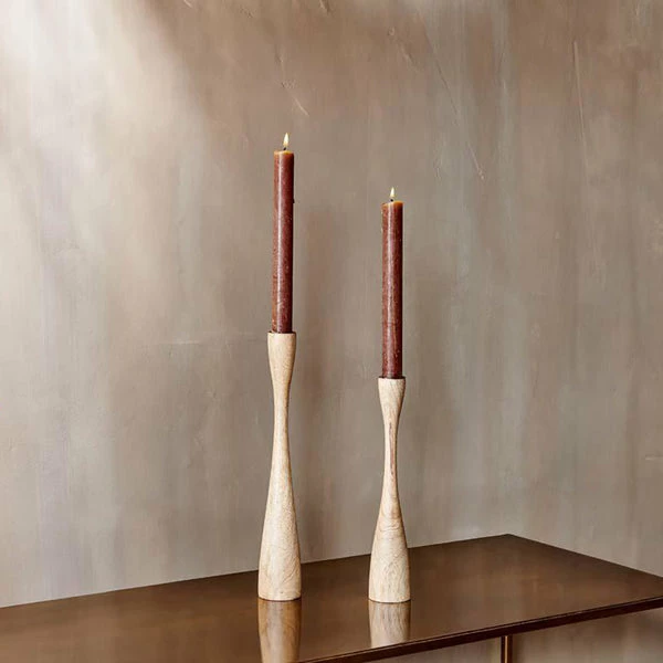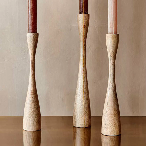 Hand crafted from sustainable mango wood, these gorgeous candlesticks are perfect for adding a hint of natural, earthy style to your interior. The smooth, natural forms are carved by hand, and include a metal candle holder, to fit a standard 2cm diameter dinner candle. Small Natural Mango Wood Candlestick. Sold individually. Hand carved. Made from sustainable mango wood.* Dimensions approx. 25.5cm (H) x 5cm (Diameter). Fits standard dinner candle, 2cm (dia). *Made from sustainable mango wood. The Mango trees are initially grown for their fruit, harvested over a number of years. Once the trees have stopped bearing fruit, they can be cut down and used to make wooden pieces. This allows farmers to plant more trees and provides them with a supplementary income. Care Instructions: Please position candle securely. This product will get hot in use. Keep out of reach of children. Wait until fully cooled before handling. Never leave a burning candle unattended.