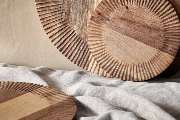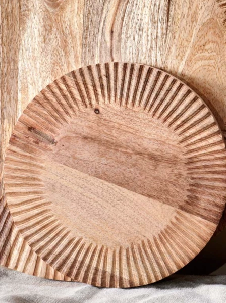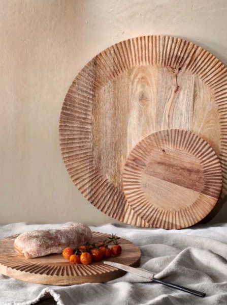Decorative yet practical, our round Soria Chopping Board is hand carved from sustainable mango wood. The board features a pretty, hand crafted etched edge, resulting in a textured and attractive pattern that translates from practical use in the kitchen, to the table. Dimensions: 24cm x 24cm x 1.8cm Colour/Material: Mango Wood Care: Hand wash only and dry immediately. Due to the nature of the natural material, edible oils(such as olive oil) can be rubbed into the surface to protect, colour may vary over time.
