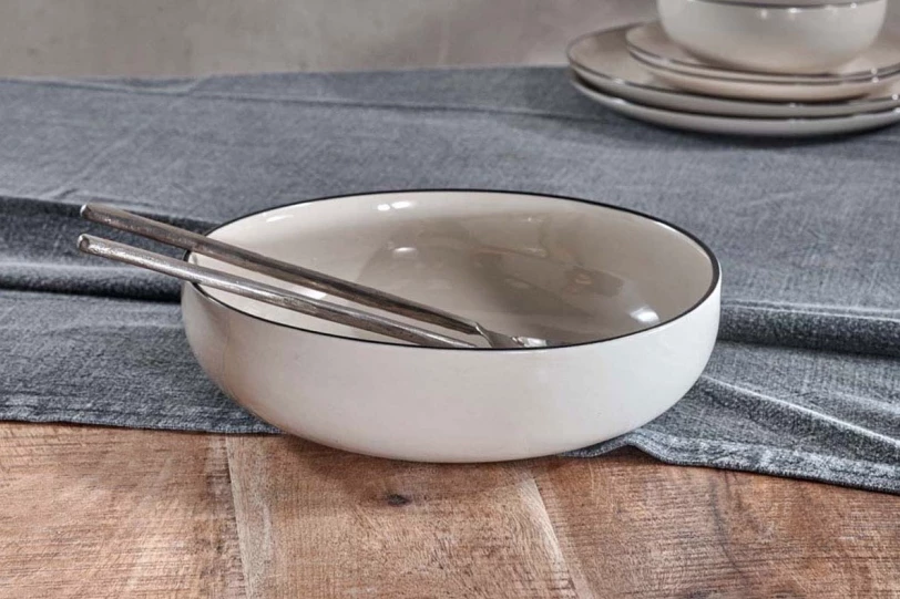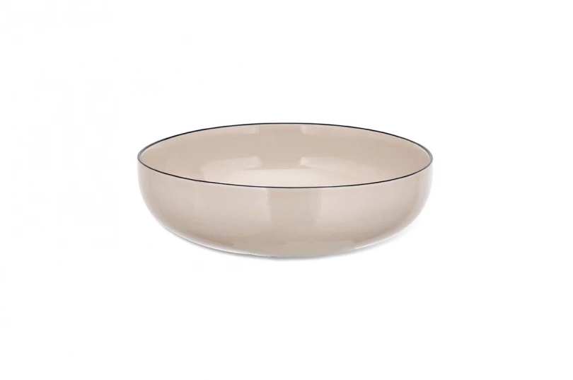 These ceramics are handmade in Vietnam by skilled artisans, using a wealth of techniques some that are thousands of years old. The collections are painted and shaped by hand incorporating indigenous and contemporary influences. Colour: White with Black rim Material: White Clay Size: 7 cm x 26 cm Dia Weight: 1230g Perfectly proportioned, our Tala serving bowls have a subtle off-white glaze and unassuming black rim. The simple design is clean and elegant.