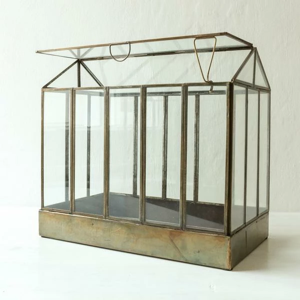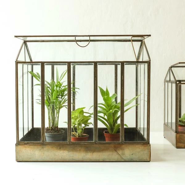 Elegant and refined, Nkuku’s large Telaga Terrarium is a striking display case for plants. Design your own indoor miniature garden in between its elegant glass panels. The greenhouse design comes complete with exquisite details from small latches and roof openings. These terrariums and planters are designed to hold indoor plants, succulents and cacti. However, they have a zinc base and are not suitable for use with excessive moisture and watering. We recommend you use a protective layer to preserve the finish and water plants with a light spray. Contact with excessive moisture is to be avoided. 31cm x 33cm x 20cm