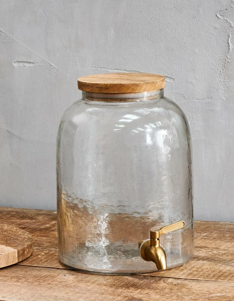 Textured, recycled glass water dispenser with wooden top and brass tap. The perfect entertaining accessory, this Water Dispenser is handmade from recycled glass. The beautifully textured glass is crafted using traditional tools, creating this eye-catching hammered finish. The top is handmade from sustainable mango wood with a practical seal and the tap is made from brass. Ideal for summer parties. Size: 29.845 x 26 x 21cm, 3.8kg, 6800ml Material: Mango Wood and glass