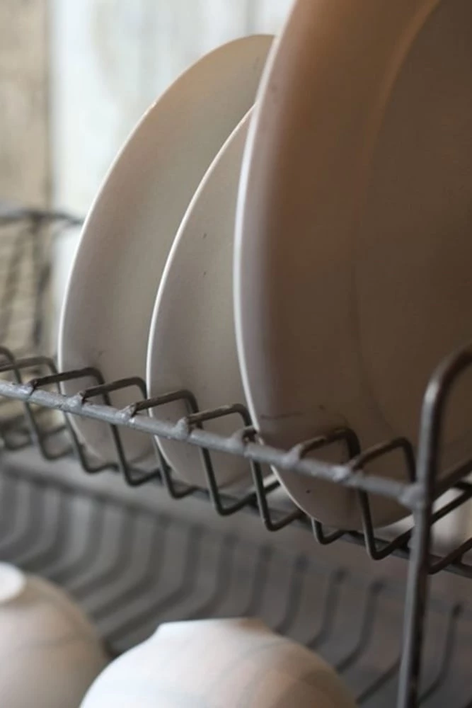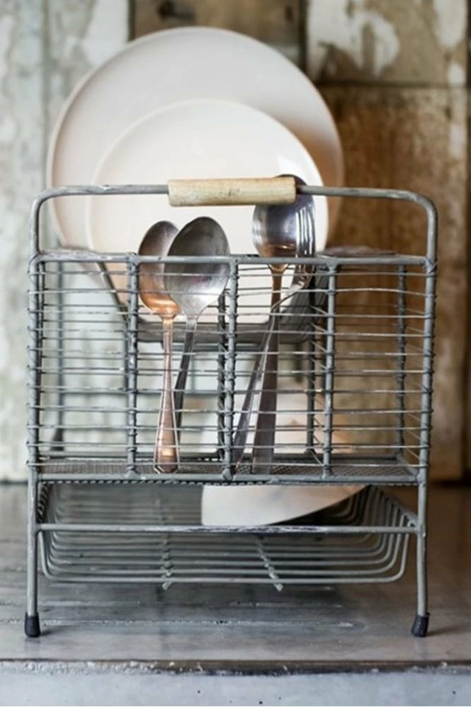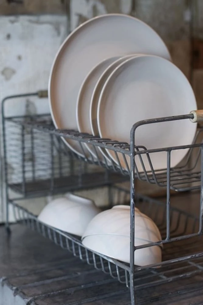 Nkuku Tilmo Dish rack Two tiered design Handmade Plate racks Storage compartments 28 x 47 x 25cm Product Code: 28224 Making an everyday chore that little bit easier, Nkuku’s ‘Tilmo’ dish rack is a stylish take on an essential piece. In a distressed grey finish, the dish rack offers an industrial look, and has plate racks and storage compartments for drying cutlery and utensils. In a two tiered space-saving design, it has been handmade by master artisans for a high quality finish.