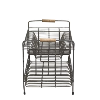The dish rack has a beautiful distressed grey finish and wooden handles.