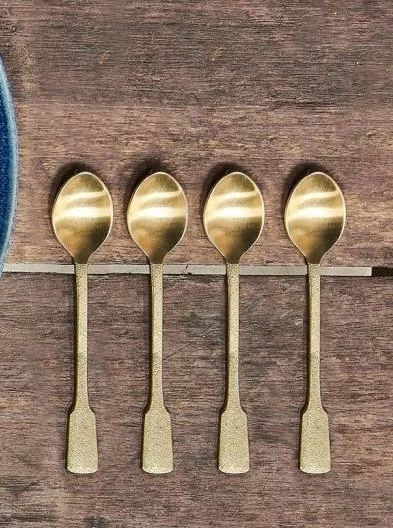 An elegant gift, and a practical accompaniment to your dinner service, these hand forged Veeta teaspoons, have a refined elegance and characterful charm. The stainless steel spoon heads are dressed with tactile, brushed gold handles. The set comes beautifully gift boxed. Nkuku cutlery has an artisanal look with a practical and tactile handle shape. Each piece is made from durable stainless steel; the handles are forged using traditional techniques. Dimensions: 13.5 x 2.5 x 1cm Care: Dishwasher safe Material: Stainless steel