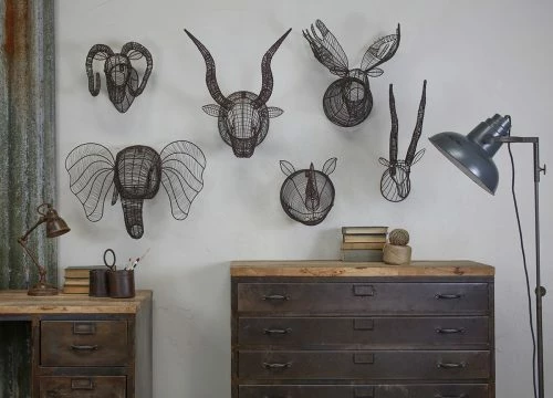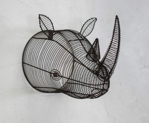 This beautiful Eko Wire rhino head has been skillfully sculpted from wire. The intricate work creates an amazing piece of decoration for your walls and is a demonstration of the skill of the craftsman who creates them. It is a true piece of art. They are the perfect size to decorate the wall above a desk or in a hallway. Combine various elements like photo frames, trophies, and other eclectic pieces. This trophy belongs to the Eko Collection of animal trophies of various sizes.