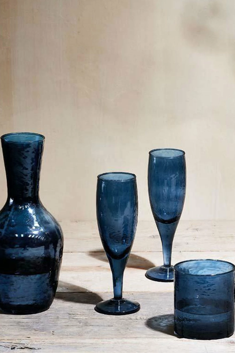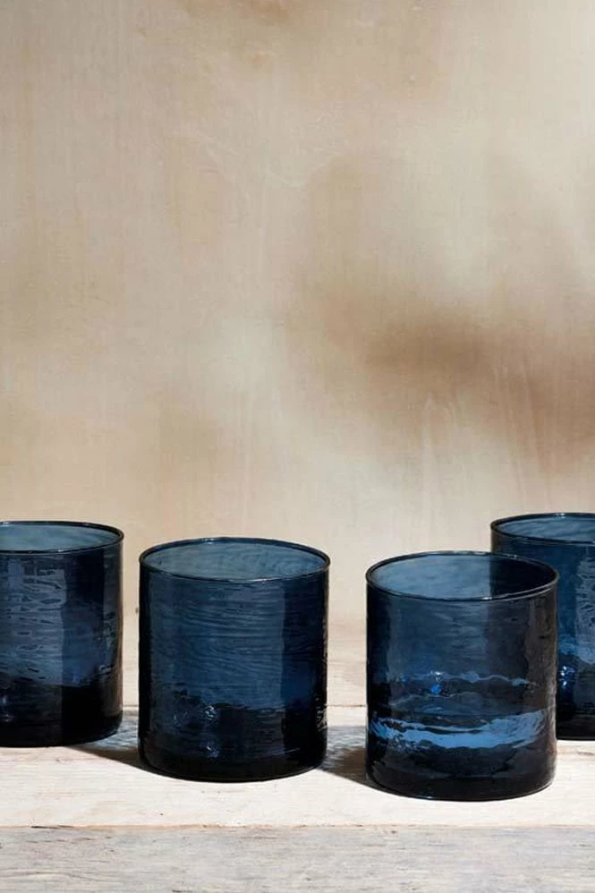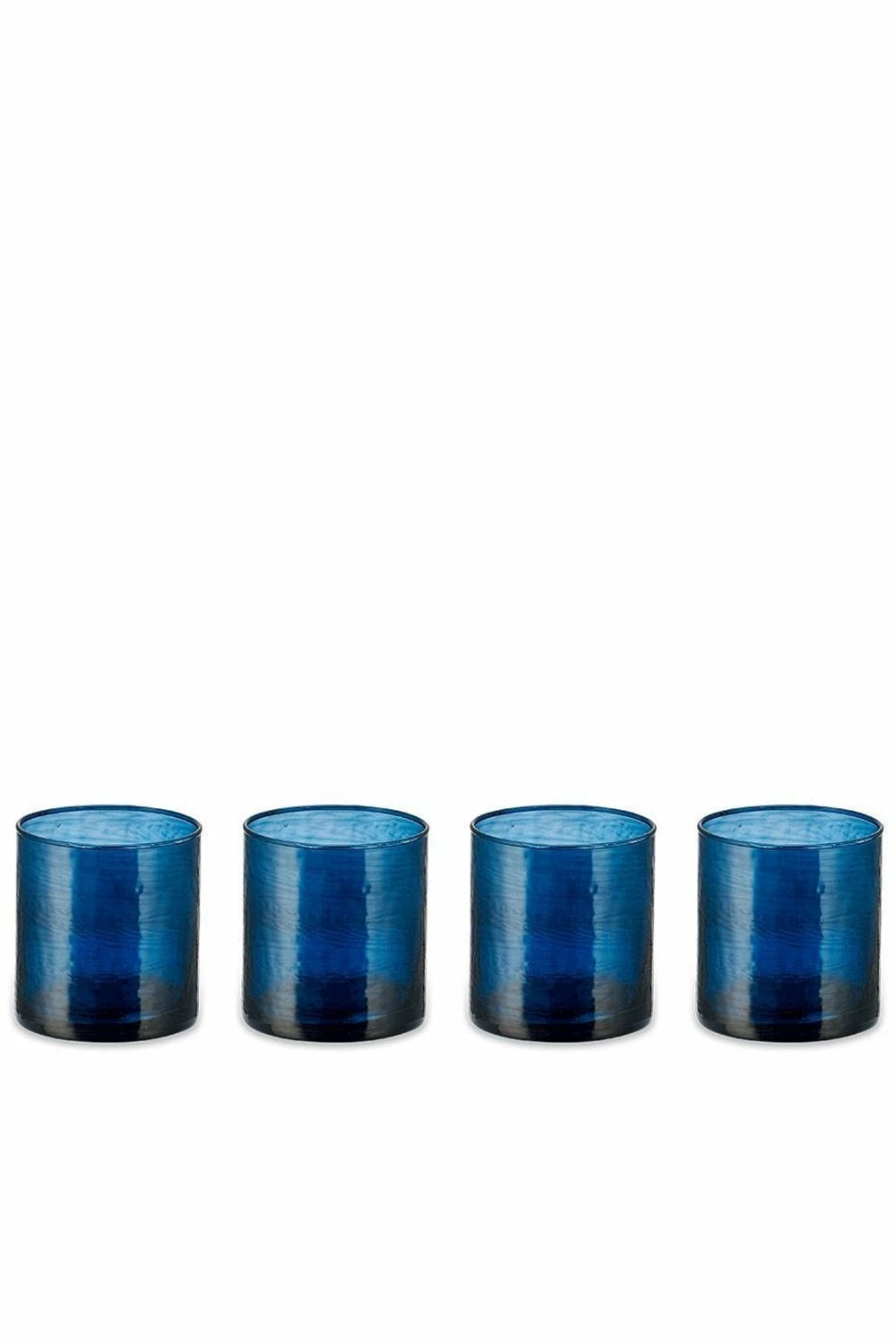 Nkuku Yala Hammered Tumblers Indigo Recycled Glass Hammered Glass Finish Mediterranean Seas Set of 4 9cm x 8.5cm x 8.5cm