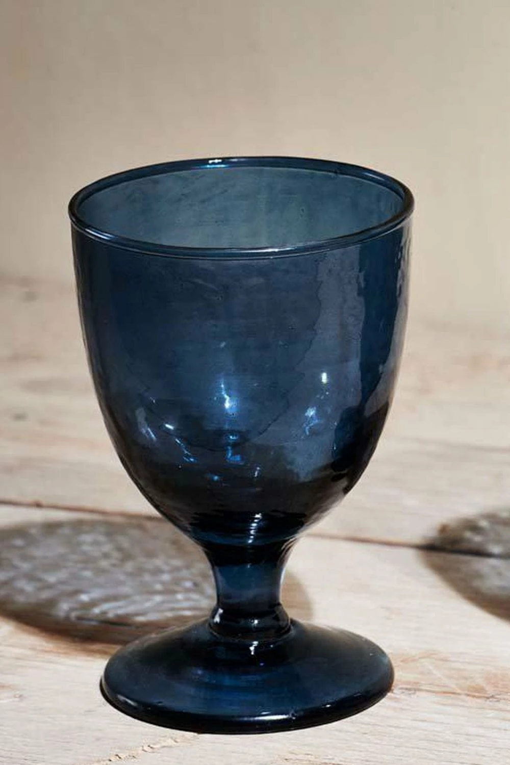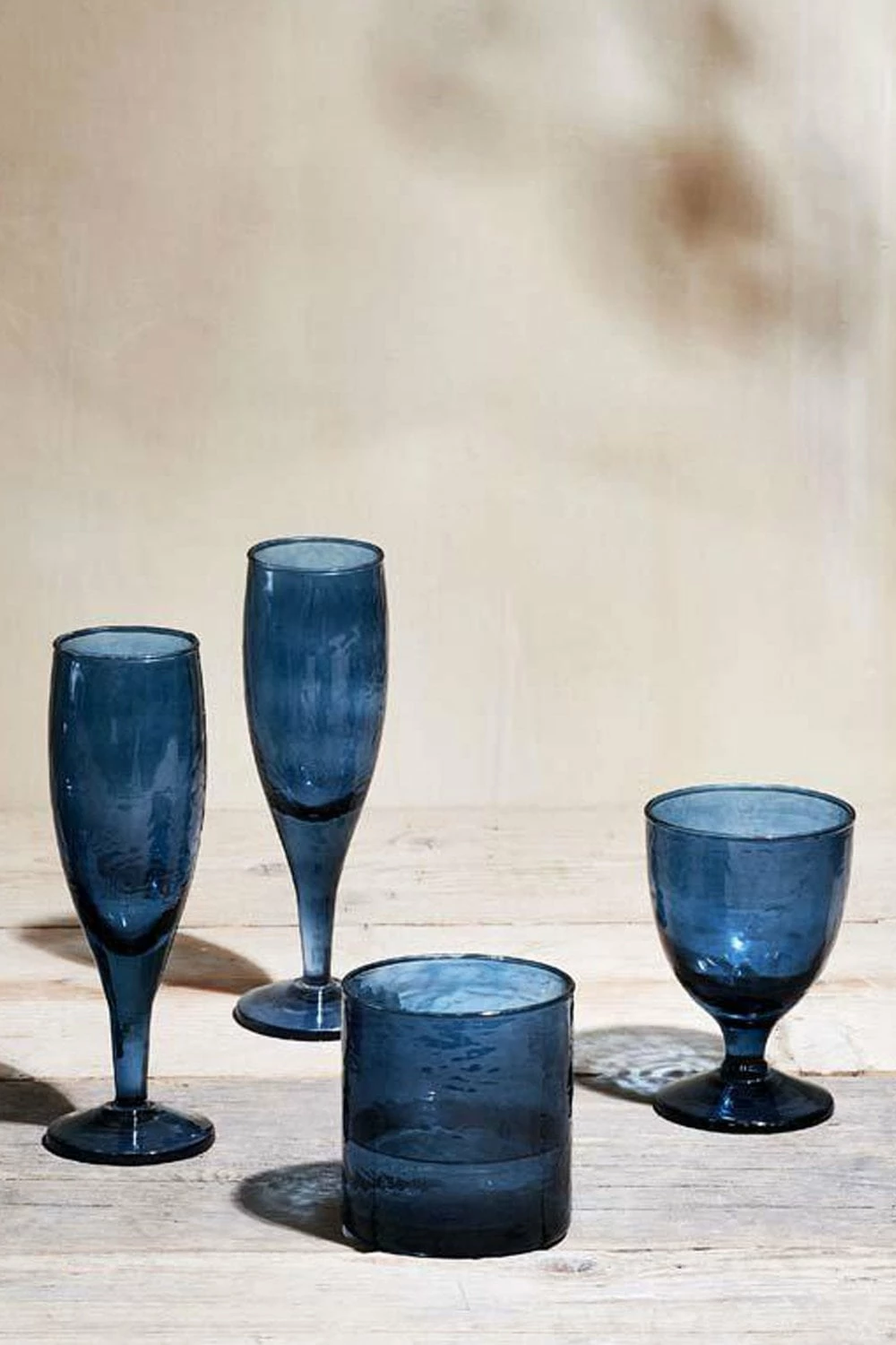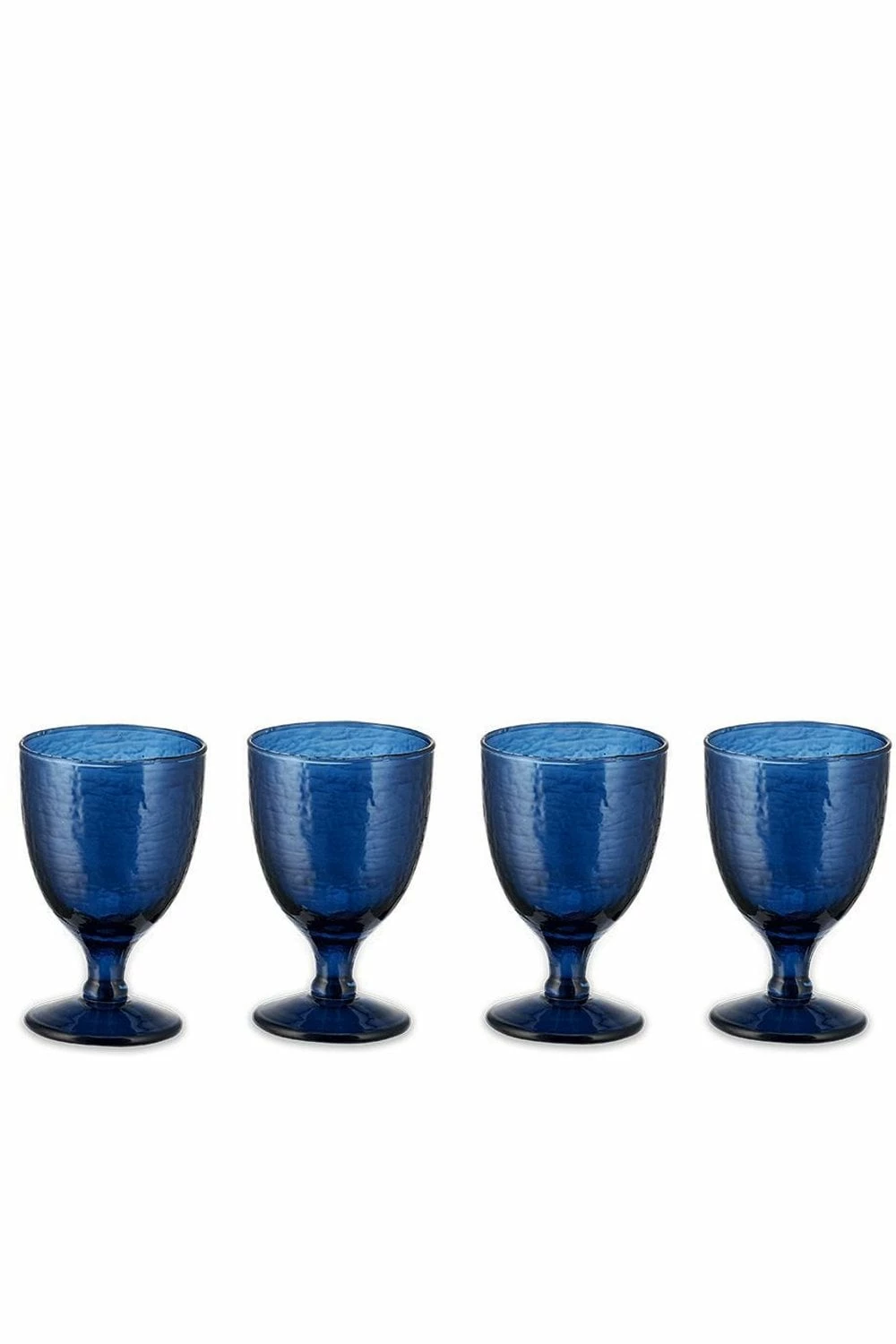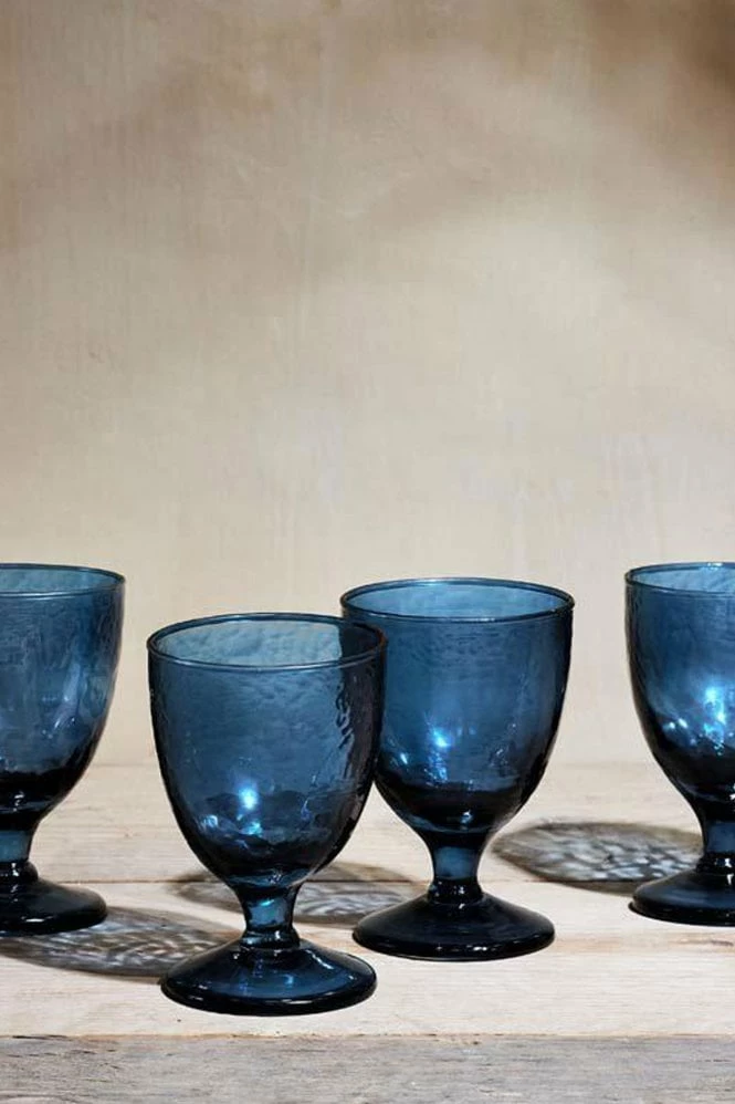 Nkuku Yala Hammered Wine Glass Indigo Recycled Glass Hammered Glass Finish Mediterranean Seas Set of 4 12cm x 7.5cm x 7.5cm