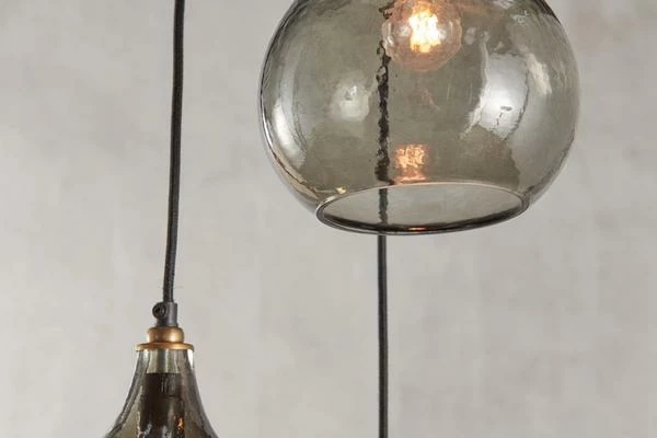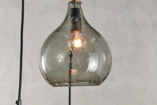 The distinctive design of our Ziva cluster pendant light makes it a standout feature. The glass pendant shape is handblown in a tactile and organic shape, enhanced with a subtle green smoke shade of colour. Each pendant light features a brown fabric cord. The height of the pendant can be adjusted to fit the space required. Style in a hallway or stairwell for an elegant feature. 135 x 20 x 17cm Bulb: E14 40W Height can be adjusted by an electrican. Ceiling rose diameter is 20cm. Ceiling rose colour is antique brass. Cord Length: 135cm